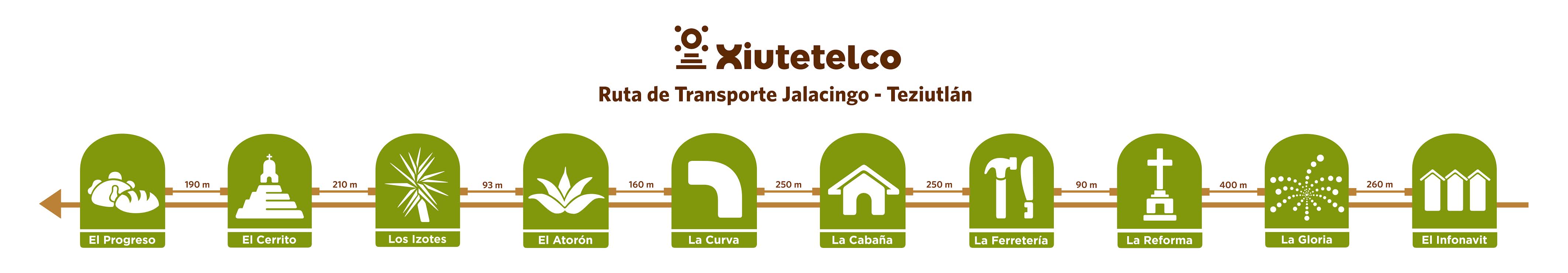Posteriormente generó una serie de pictogramas e íconos claramente identificables para usuarios y turistas. Estas piezas fueron la base para el desarrollo de los mapas de ubicación, las columnas informativas e identificación de calles. La identidad misma de la ciudad, inspirada en el reconocimiento del origen de su nombre (Xiutetelco: "pirámide en el hierbazal"), es resultado de un estudio cuidadoso de las formas y su significado histórico.